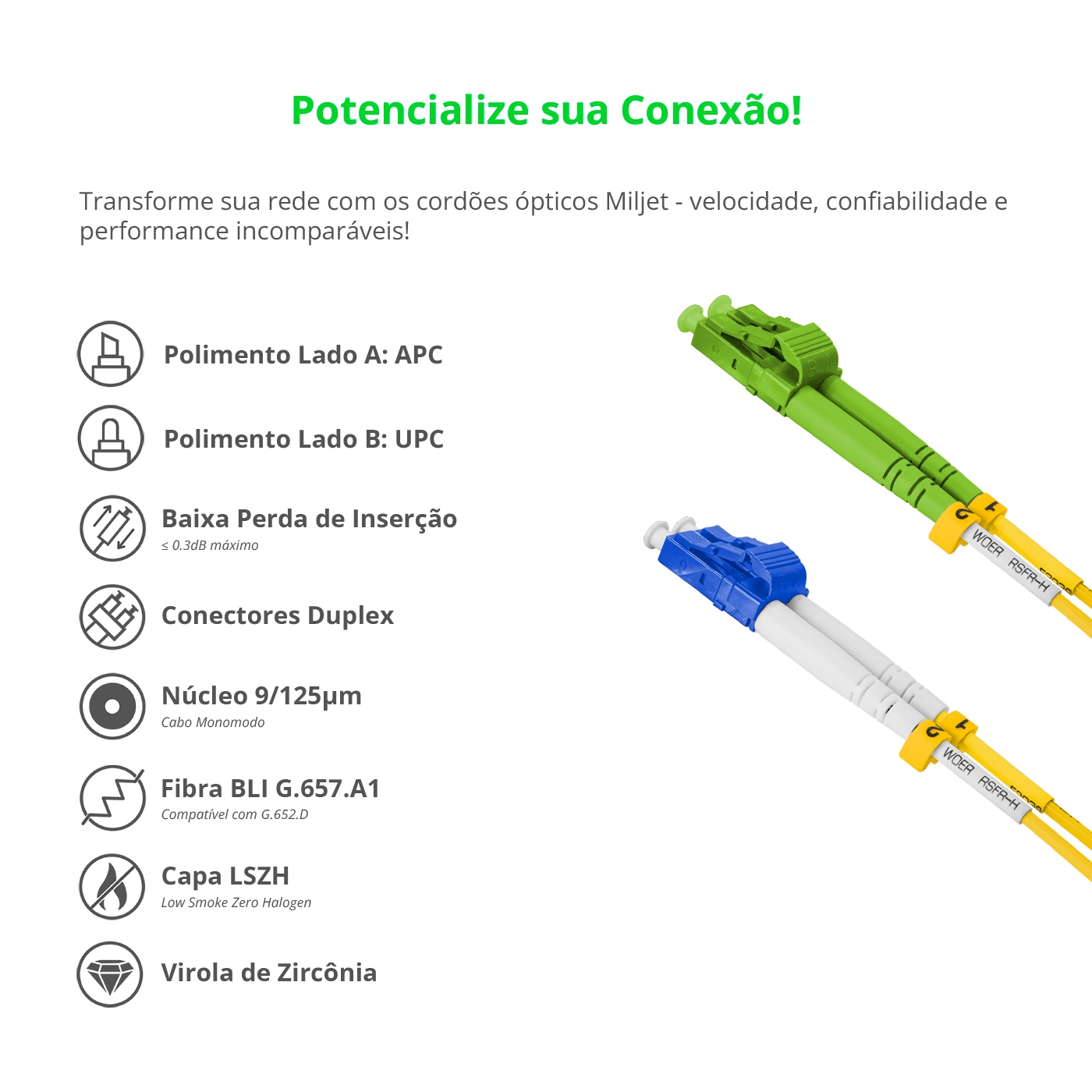 O cordão óptico Miljet MJ-DF-LCA-LCU-S310, também conhecido por patch cord óptico de fibra, é fabricado com fibra óptica Monomodo OS2 9/125μm, tipo de grau G.657.A1 / G.652.D e possui em suas extremidades conectores de cerâmica de zircônia LC-APC para LC-UPC Duplos (2 Fibras) de alta qualidade, que eleva a qualidade de precisão do conector e é rigorosamente testado para ter baixa perda de inserção e menor perda de retorno, garantindo o desempenho e qualidade superiores para os circuitos de dados de 1G até 400Gbps. Esses conectores de encaixe são normalmente usados ​​para conexões de alta densidade e são compatíveis com dispositivos plug-and-play, como módulos transceptores SFP, XFP, SFP+, SFP28, QSFP+, QSFP28, CFPs a distribuidores ópticos (DGO, DIO) ou qualquer outro equipamento com interfaces Duplex LC/LC Monomodo, usados para conexões em ambientes internos de curta distância SMF. Entre outras vantagens, o cabo Miljet diferente de varios outros fabricantes, possuem revestimento LSZH (Low smoke zero halogen) que é um tipo especial de material resistente a fogo, fumaça e altas temperaturas.