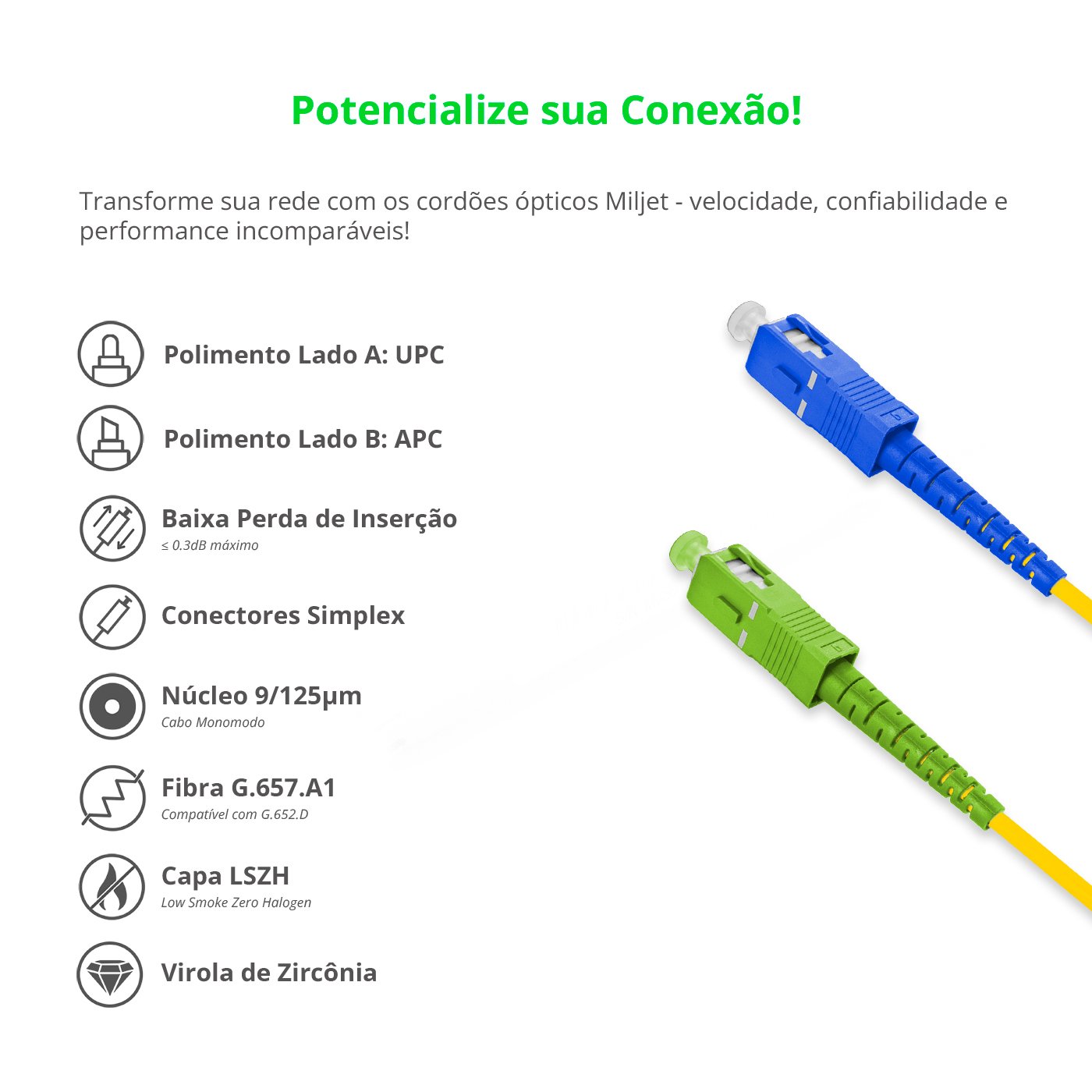 1 Unidade: Cordão Óptico 1m, SC/UPC-SC/APC, SM BLI G657-A1 9/125, OS2 Simplex 3.0mm LSZH Amarelo, Fibra Monomodo Miljet