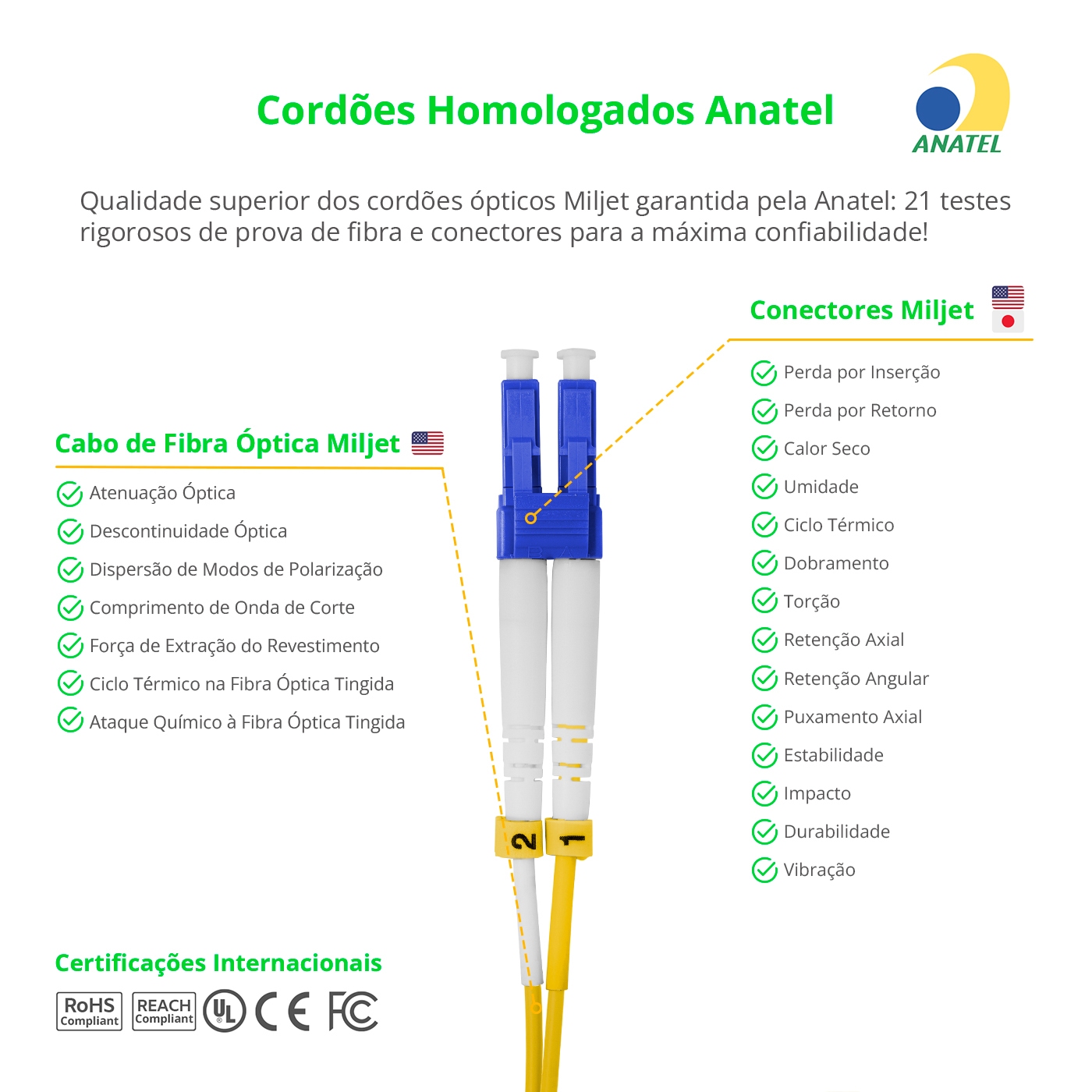4. Os cabos e cordões MILJET possuem alta qualidade com HOMOLOGAÇÃO ANATEL, CE, FCC, RoHS Compliant., integrando projeto de engenharia próprio certificado mundialmente, no qual todos os componentes são minuciosamente escolhidos e testados com base nas melhores práticas, parceiros e produtos internacionais, para que tenham o melhor desempenho, performance, compatiblidade e durabilidade.