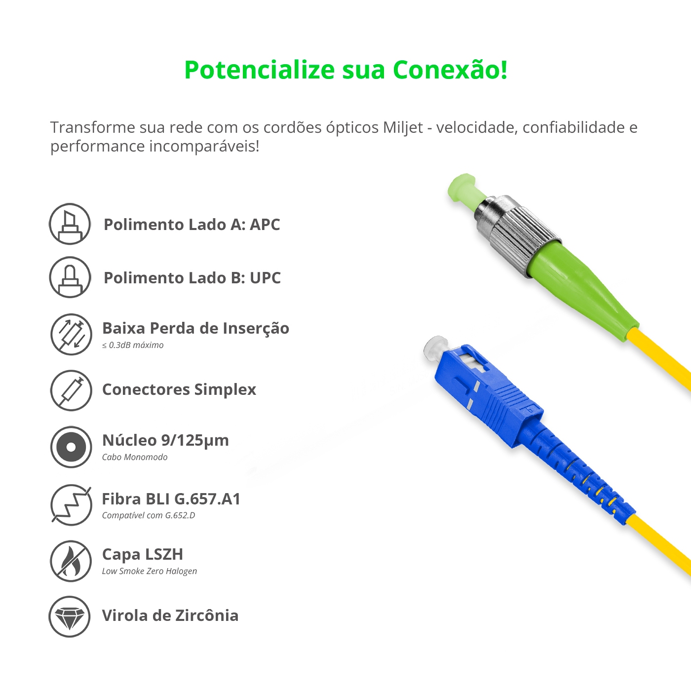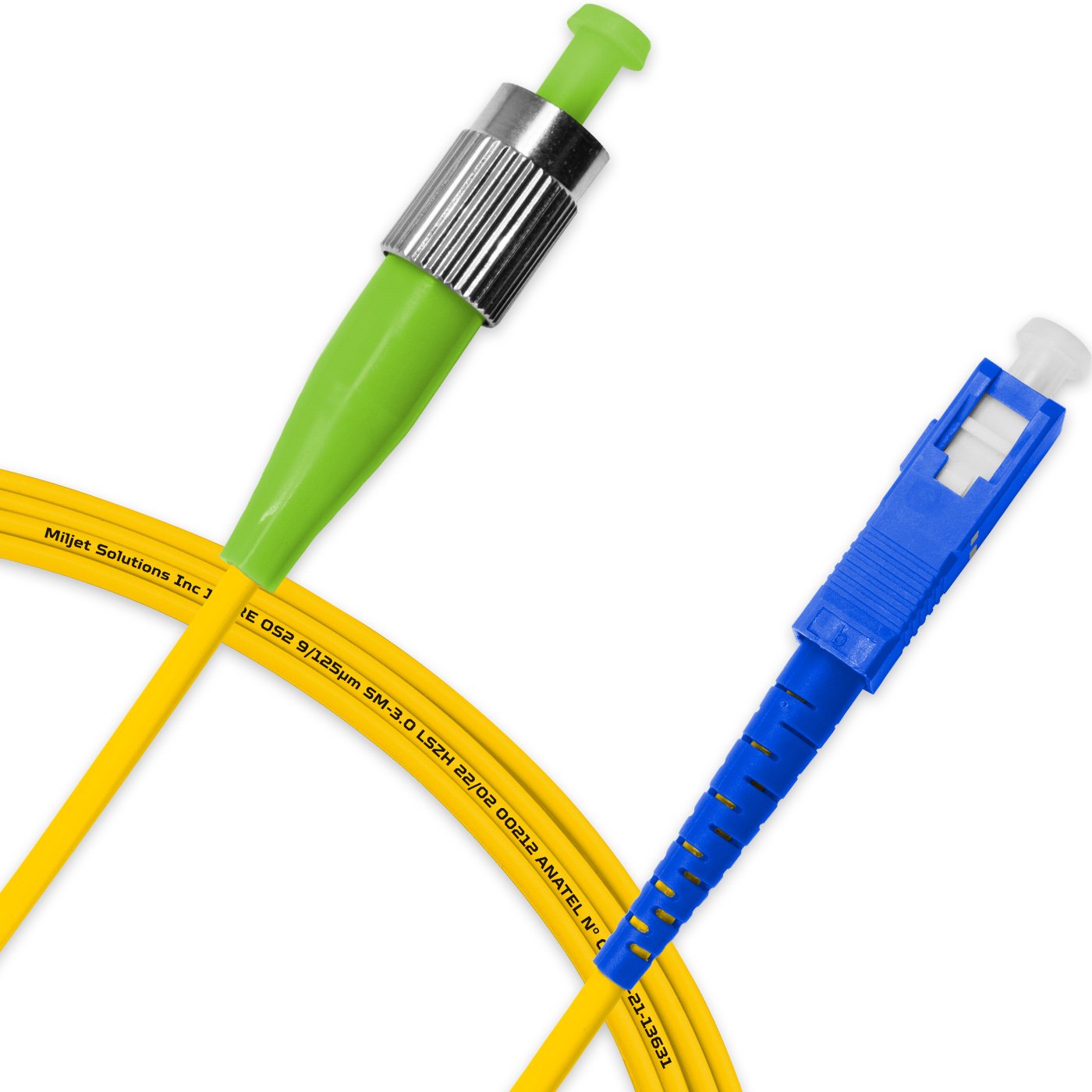 O cordão óptico Miljet MJ-SF-FCA-SCU-S233, também conhecido por patch cord óptico de fibra, é fabricado com fibra óptica Monomodo OS2 9/125μm, tipo de grau G.657.A1 / G.652.D e possui em suas extremidades conectores de cerâmica de zircônia FC-APC para SC-UPC Simplex (1 Fibra) de alta qualidade, que eleva a qualidade de precisão do conector e é rigorosamente testado para ter baixa perda de inserção e menor perda de retorno, garantindo o desempenho e qualidade superiores para os circuitos de dados de 1G até 400Gbps. Esses conectores de encaixe são normalmente usados para conexões de alta densidade e são compatíveis com dispositivos plug-and-play, como módulos transceptores Bi-Direcionais (1 Fibra) para Distribuidores ópticos (DGO, DIO, CTO Etc.) ou qualquer outro equipamento com interfaces Simplex FC ou SC Monomodo, usados para conexões em ambientes internos de curta distância SMF. Entre outras vantagens, o cabo Miljet diferente de varios outros fabricantes, possuem revestimento LSZH (Low smoke zero halogen) que é um tipo especial de material resistente a fogo, fumaça e altas temperaturas.