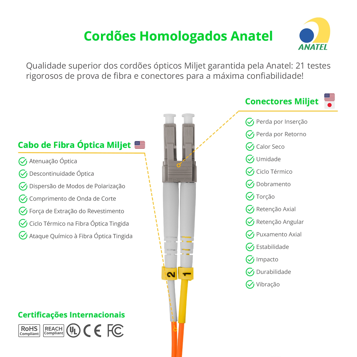4. Os cabos e cordões MILJET possuem alta qualidade com HOMOLOGAÇÃO ANATEL, CE, FCC, RoHS Compliant, integrando projeto de engenharia próprio certificado mundialmente, no qual todos os componentes são minuciosamente escolhidos e testados com base nas melhores práticas, parceiros e produtos internacionais, para que tenham o melhor desempenho, performance, compatiblidade e durabilidade.