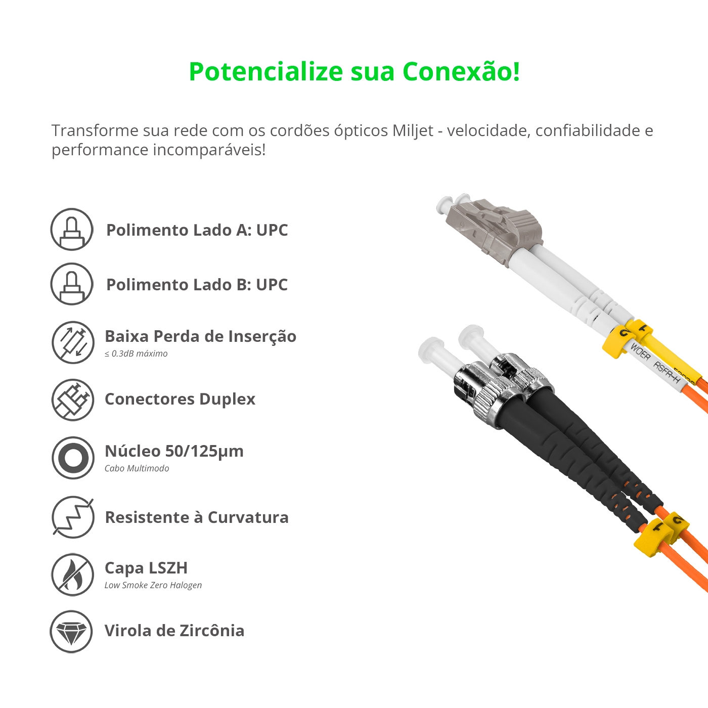 O cordão óptico Miljet MJ-DF-LCU-STU-MM03, também conhecido por patch cord óptico de fibra, é fabricado com fibra óptica Multimodo OM2 50/125μm e possui em suas extremidades conectores de cerâmica de zircônia LC-UPC para ST-UPC Duplos (2 Fibras) de alta qualidade, que eleva a qualidade de precisão do conector e é rigorosamente testado para ter baixa perda de inserção e perda de retorno, garantindo o desempenho e qualidade superiores para os circuitos de dados. Esses conectores de encaixe são normalmente usados ??para conexões de baixa densidade e são compatíveis com dispositivos plug-and-play, contanto que sejam Multimodo com interfaces Duplex SC ou ST e ou demais dispositivos dentro desse requisito, usados para conexões entre 1G ~ 10Gbps, em ambientes internos de curta distância. Entre outras vantagens, o cabo Miljet diferente de varios outros fabricantes, possuem revestimento LSZH (Low smoke zero halogen) que é um tipo especial de material resistente a fogo, fumaça e altas temperaturas.