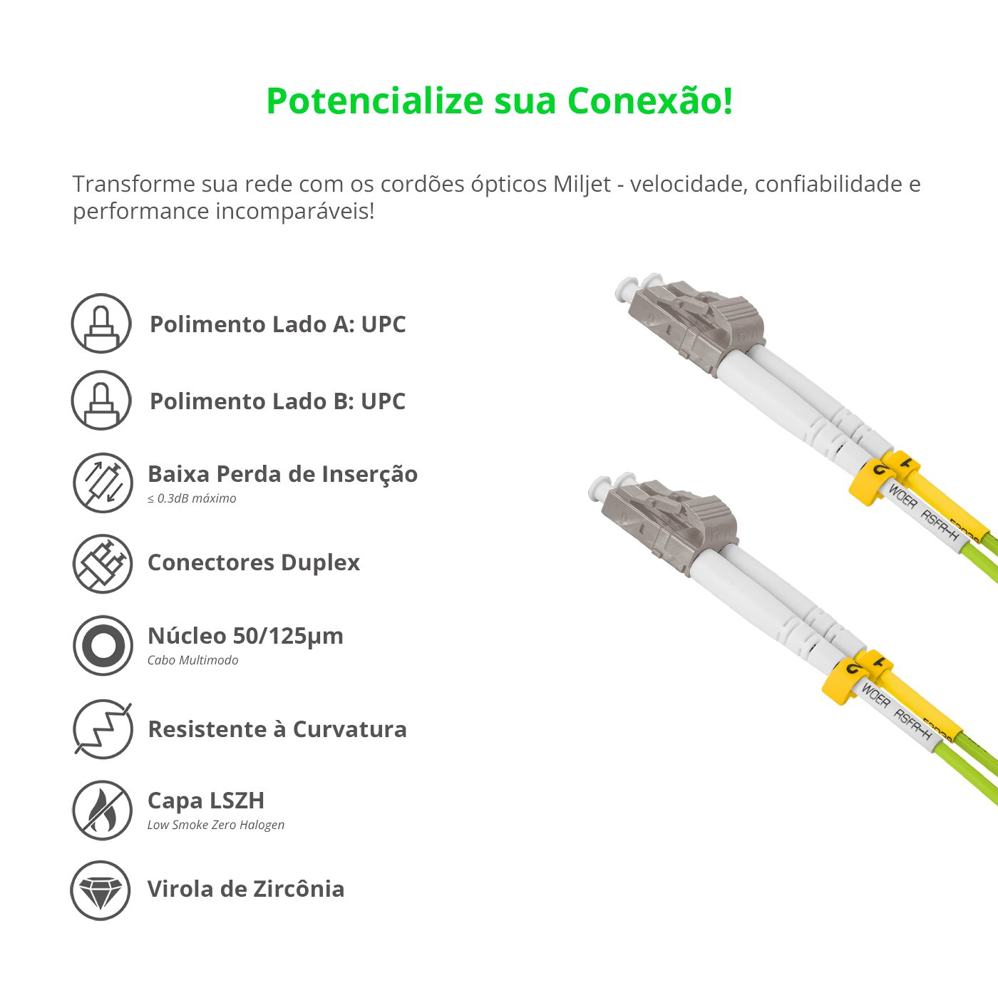 1 Unidade: Cordão Óptico 50m, LC/UPC-LC/UPC, MM G651.1 50/125, OM5 Duplex 2.0mm LSZH Verde, Fibra Multimodo Miljet