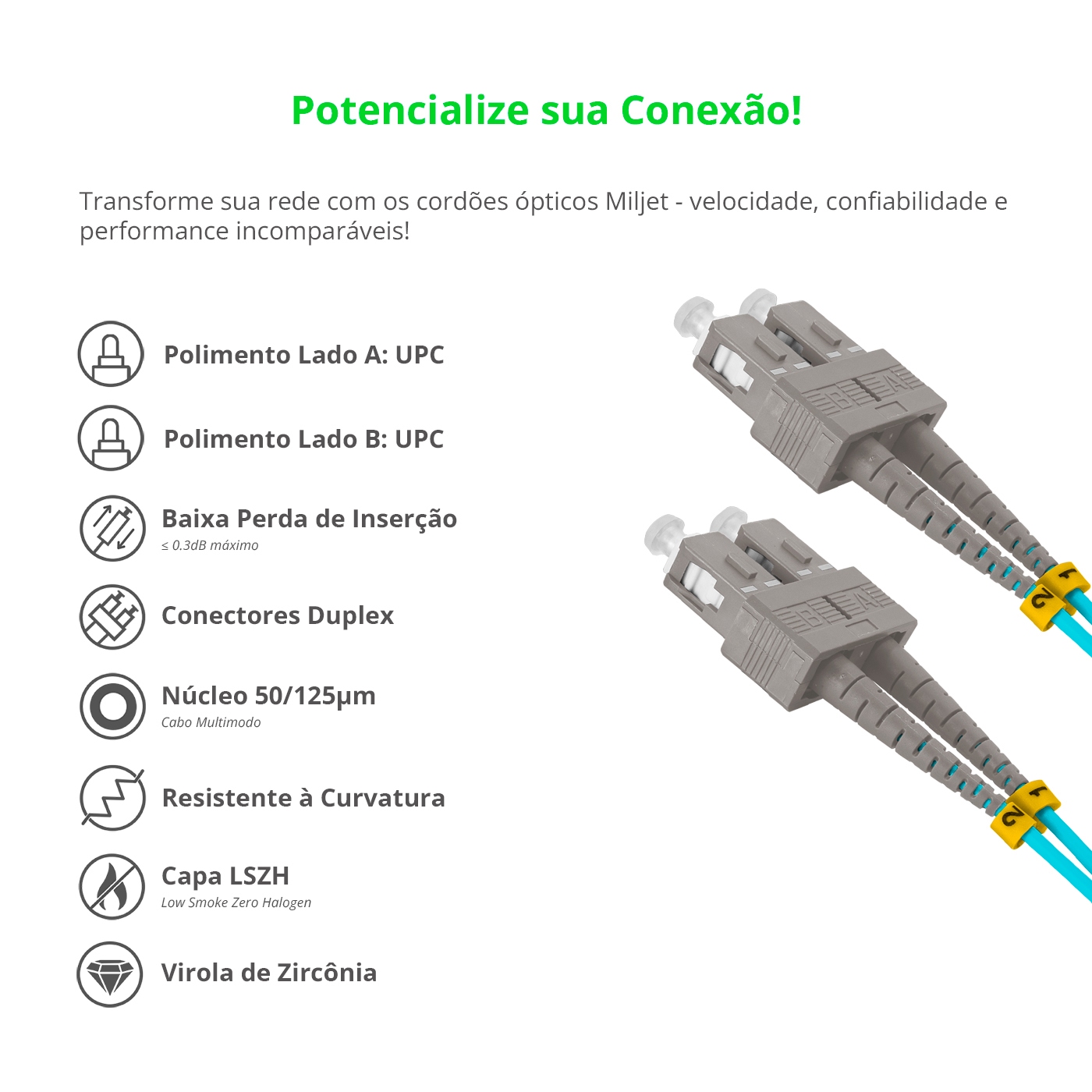 O cordão óptico Miljet MJ-DF-SCU-SCU-535U, também conhecido por patch cord óptico de fibra, é fabricado com fibra óptica Multimodo OM3 50/125μm e possui em suas extremidades conectores de cerâmica de zircônia SC-UPC para SC-UPC Duplos (2 Fibras) de alta qualidade, que eleva a qualidade de precisão do conector e é rigorosamente testado para ter baixa perda de inserção e perda de retorno, garantindo o desempenho e qualidade superiores para os circuitos de dados. Esses conectores de encaixe são normalmente usados para conexões de alta densidade e são compatíveis com dispositivos plug-and-play, como módulos que sejam Multimodo com interfaces Duplex SC e ou demais dispositivos dentro desse requisito, usados para conexões em ambientes internos de curta distância. Entre outras vantagens, o cabo Miljet diferente de varios outros fabricantes, possuem revestimento LSZH (Low smoke zero halogen) que é um tipo especial de material resistente a fogo, fumaça e altas temperaturas.
