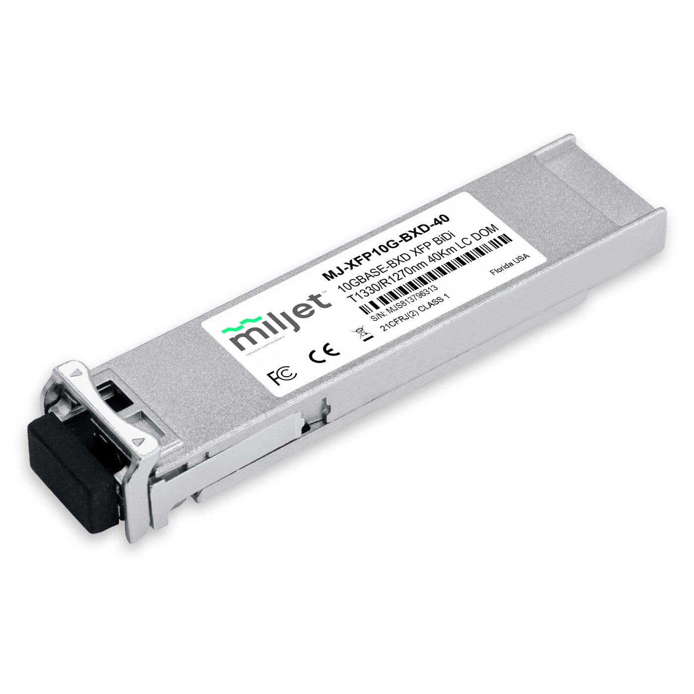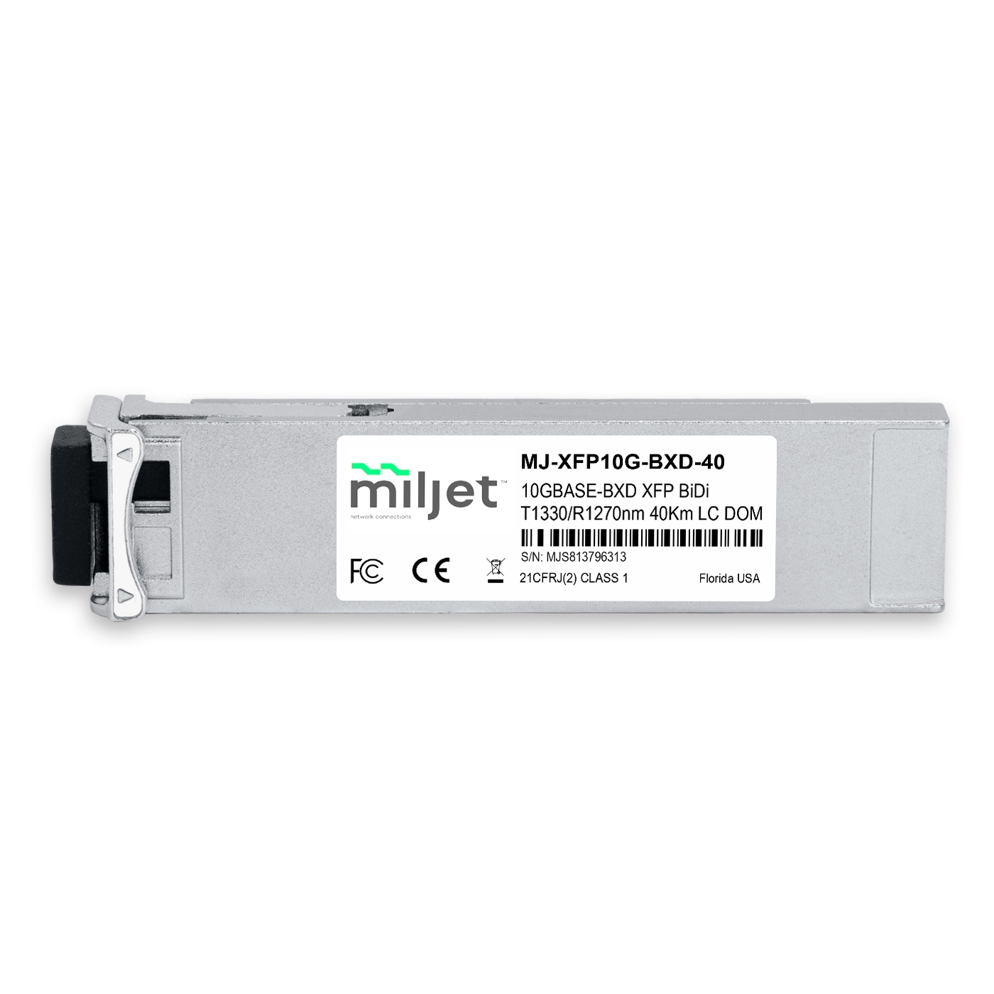O transceiver Miljet MJ-XFP10G-BXD-40 XFP usa um laser DFB com comprimento de onda combinados em 1330nm/1270nm para SMF. O seu alcance é de até 40km sobre cabos de fibra óptica monomodo, utilizando apenas 01 fibra ótica por tipo de conexão Bi-Direcional através da tecnologia WDM. O seu conector é do tipo LC e atinge até 10.31Gbps de troca de dados. Contudo, para usar esse produto plenamente é preciso combina-los em pares, necessitando do XFP lado "A" em 1270nm/1330nm para o seu funcionamento. Esse Transceptor óptico oferece possibilidades de conexões de dados de longas distâncias entre equipamentos de transmissão e comutação atendendo varios segmentos, como: Telecomunicações, TI e informática, data centers, segurança, automação industrial, Urbana, entre outros.